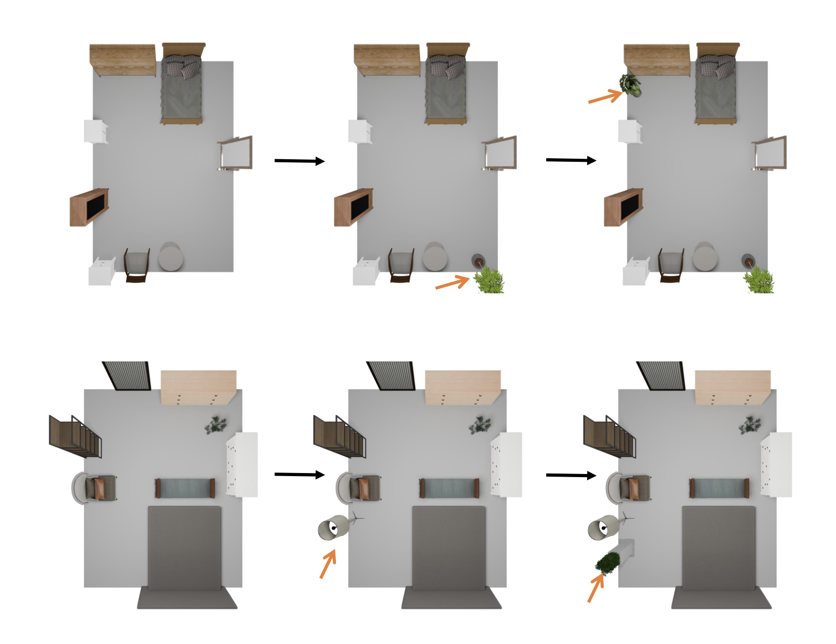 We propose an agent-based, sequential object placement framework for 3D indoor scene generation supports incremental editing and uses a solver fusing semantic and visual cues to produce more plausible, consistent, and realistic layouts.